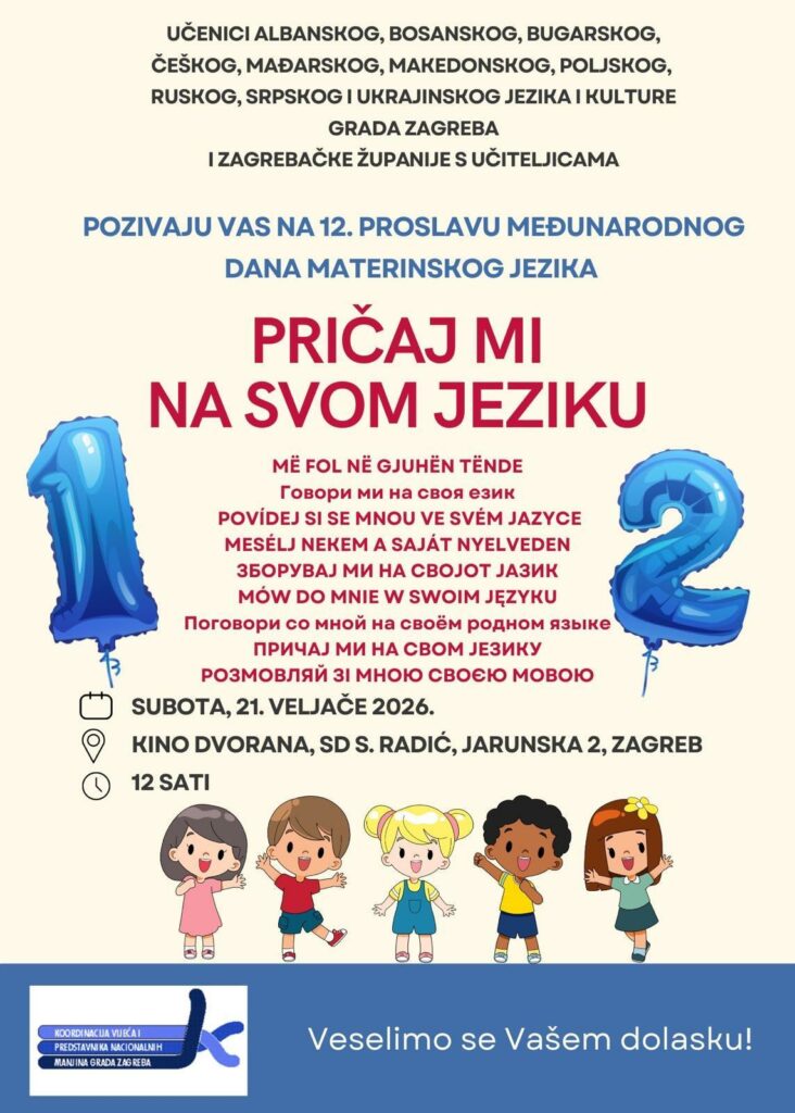 Во Загреб, на 21 февруари 2026 година, во организација на Координацијата насоветите и претставниците на националните малцинства на Град Загреб, традиционално беше одбележан Меѓународниот ден на мајчиниот јазик. На манифестацијата учествуваа ученици припадници на националните малцинства на Град Загреб кои ја посетуваат наставата на своите мајчини јазици. Под менторство на наставничката Деспина Белчовска Велинска настапија учениците Луција, Милa, Марија, Јани, Ана, Марко , Матеа, Магдалена, Марин и Маро, кои во ОУ „Никола Тесла“ ја посетуваат наставата по Македонски јазик и култура (Модел Ц). Вредните ученици самостојно направија сценарио за драматизација со наслов „Кој е најдругар?“, преку која проговараат на теми од односите меѓу учениците. За време на подготовките и настапот учениците ги развиваа комуникациските вештини и креативноста, ја зајакнуваат самодовербата, поттикнуваа тимска работа и емоционална интелигенција, како и негување на културата и чувството на припадност кон училишната заедница. Поздравот за добредојде и најавата беа доверени на Александра и Ана кои посетуваат настава на Македонски јазик во Основното училиште „Август Харамбашиќ“ во Загреб. На манифестацијата, со рецитација настапија и ученици кои посетуваат македонски јазик и култура во I. Гимназија во Загреб, во ОУ Св. Недела ПУ Стрмец и во ОУ Иван Бенковиќ во Дуго Село, под менторство на учителките Ивана Брезовец и Бранкица Богатинов. По повод меѓународниот ден на мајчиниот јазик, а со цел поттикнување на читањето и потпора во учењето и негувањето на македонскиот јазик, Советот на македонското национално малцинство за Град Загреб, на учениците им подари книги на македонски јазик.
